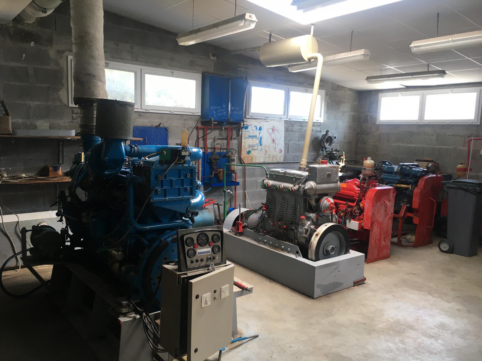 Salle de 50m2 équipée de barres et crocs pour le ramendage, avec morceaux de chaluts, filets, funes d’acier, cordages 3 ou 4 torons, épissoires, fil à ramender.